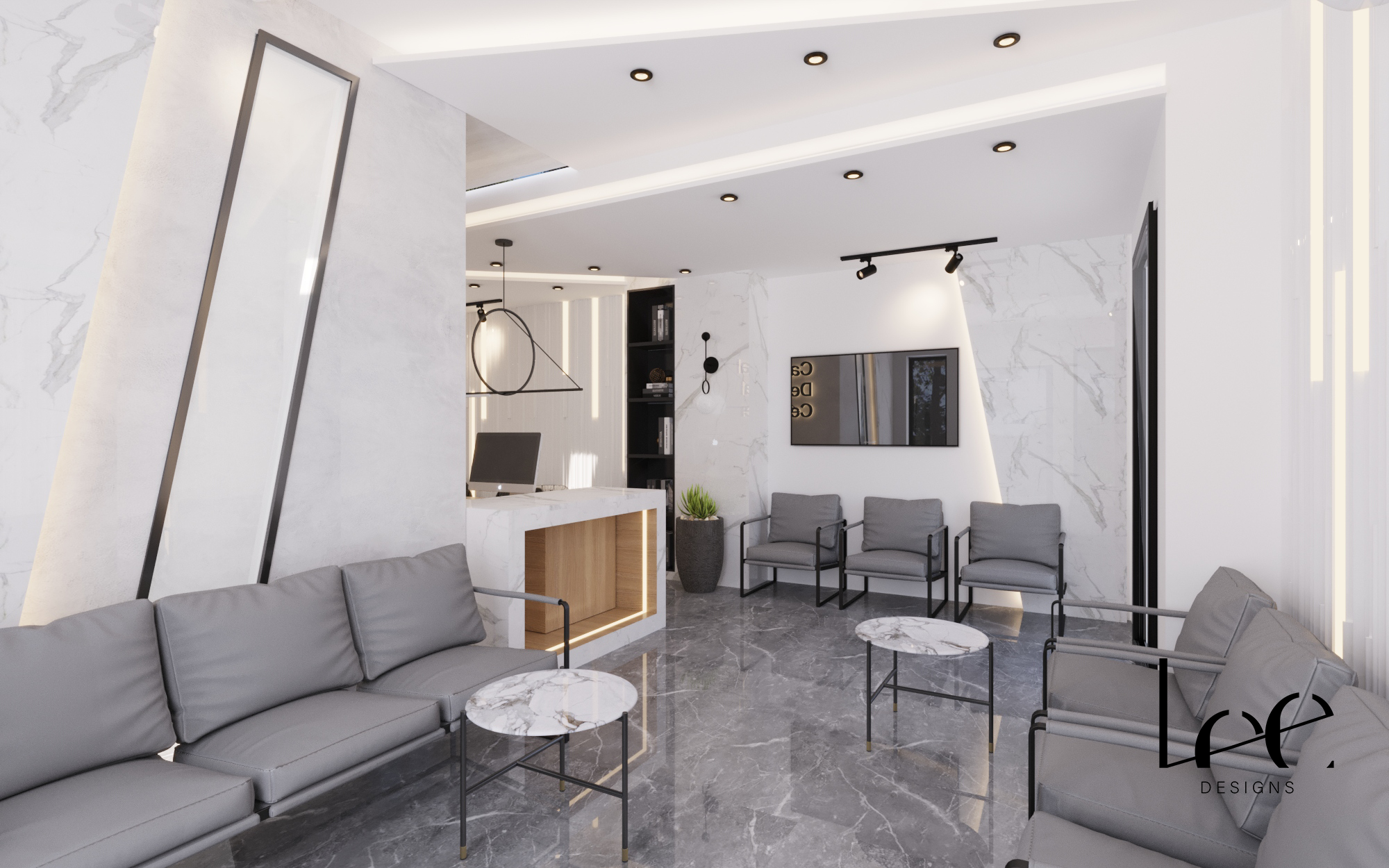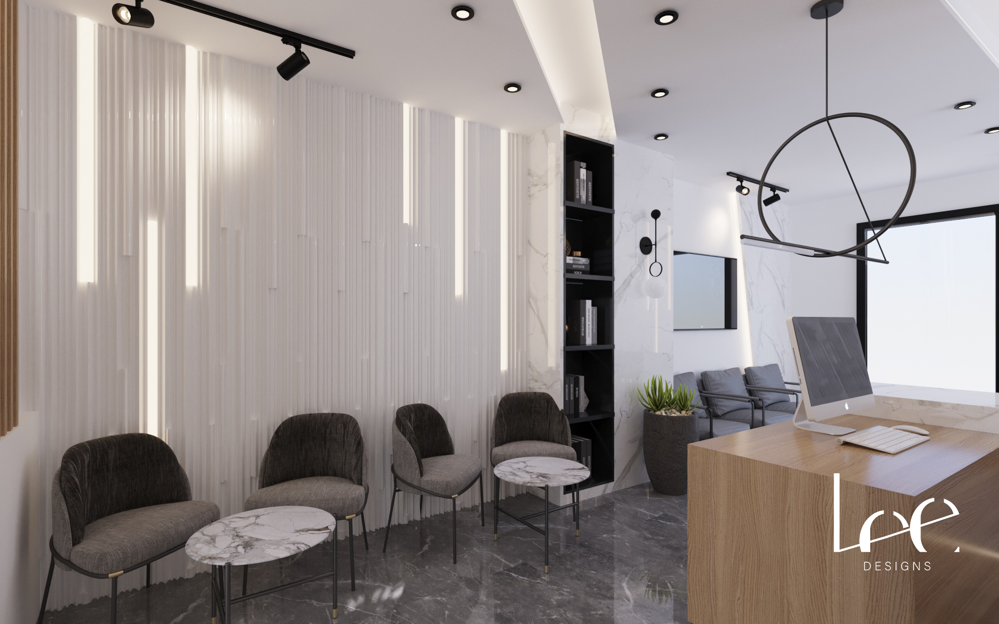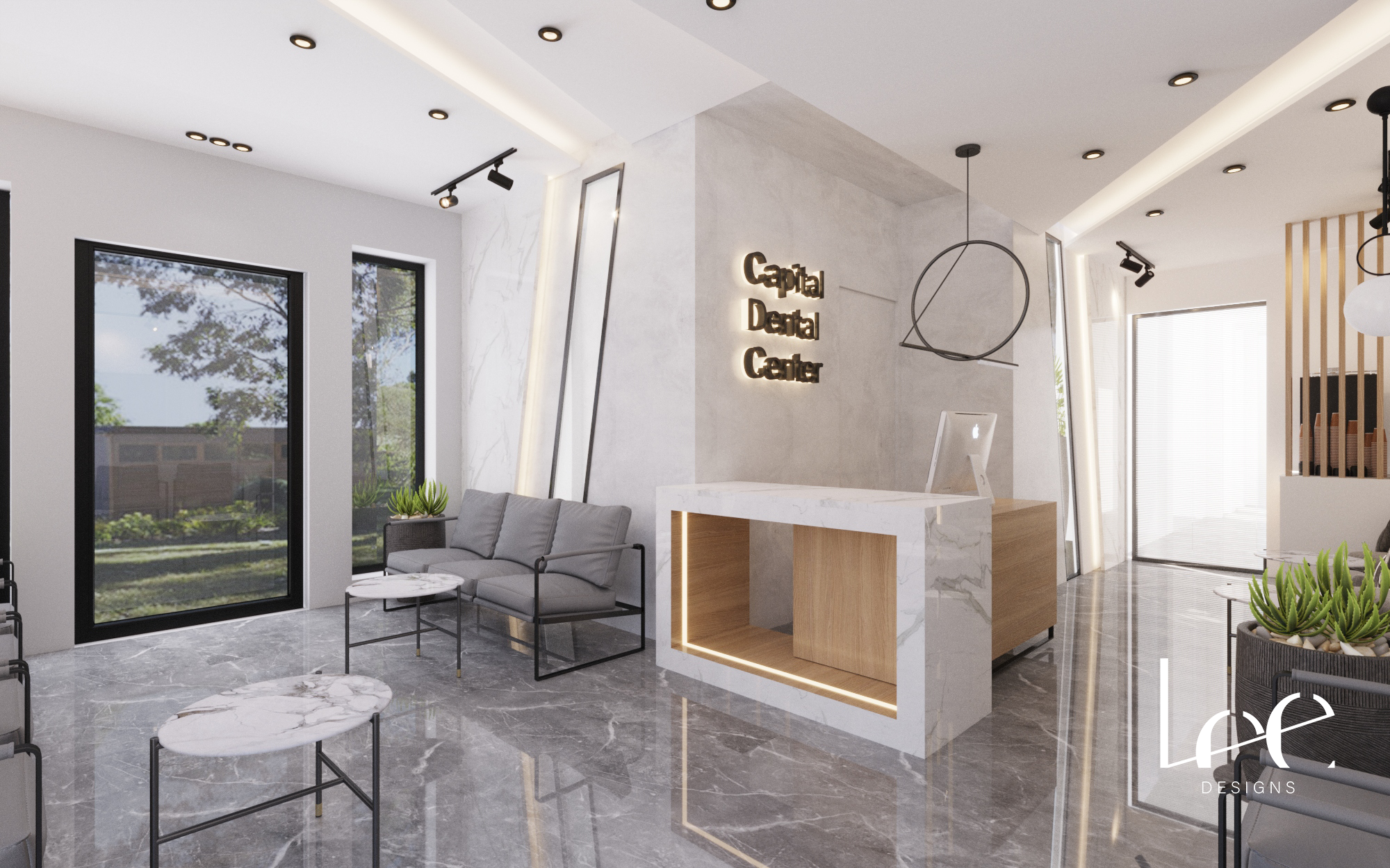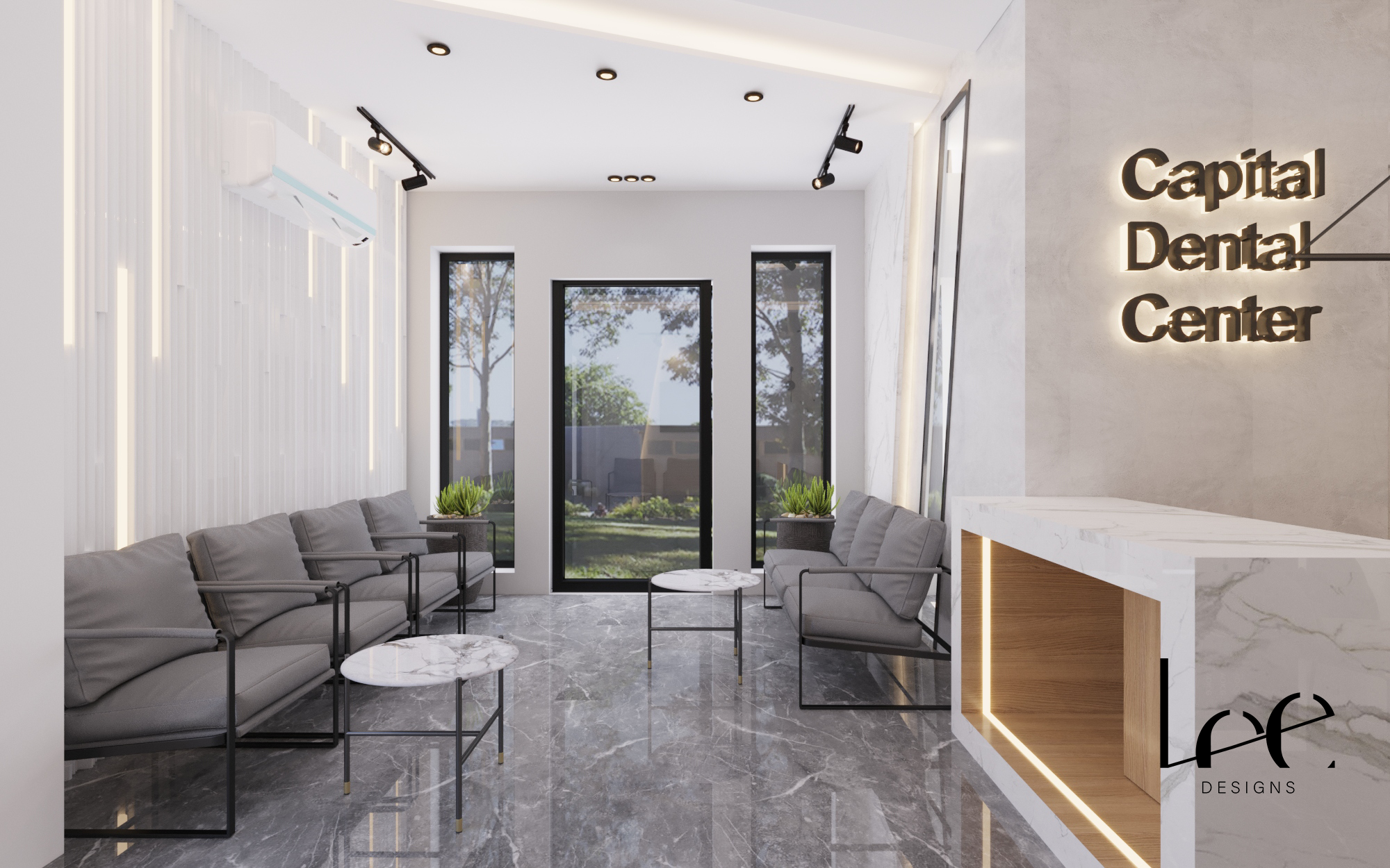 The design repositions a dental clinic interior away from a clinical aesthetic toward a calm, premium waiting environment. The material palette – grey marble floors, white marble walls, and warm timber – eliminates the sterile white-only finish typical of medical spaces while maintaining a clean and professional appearance. Black metal framing on windows, furniture, and lighting fixtures adds precision and contrast without heaviness. The garden-facing window wall is the key spatial move, replacing the anxiety typically associated with waiting rooms with a direct connection to natural greenery.