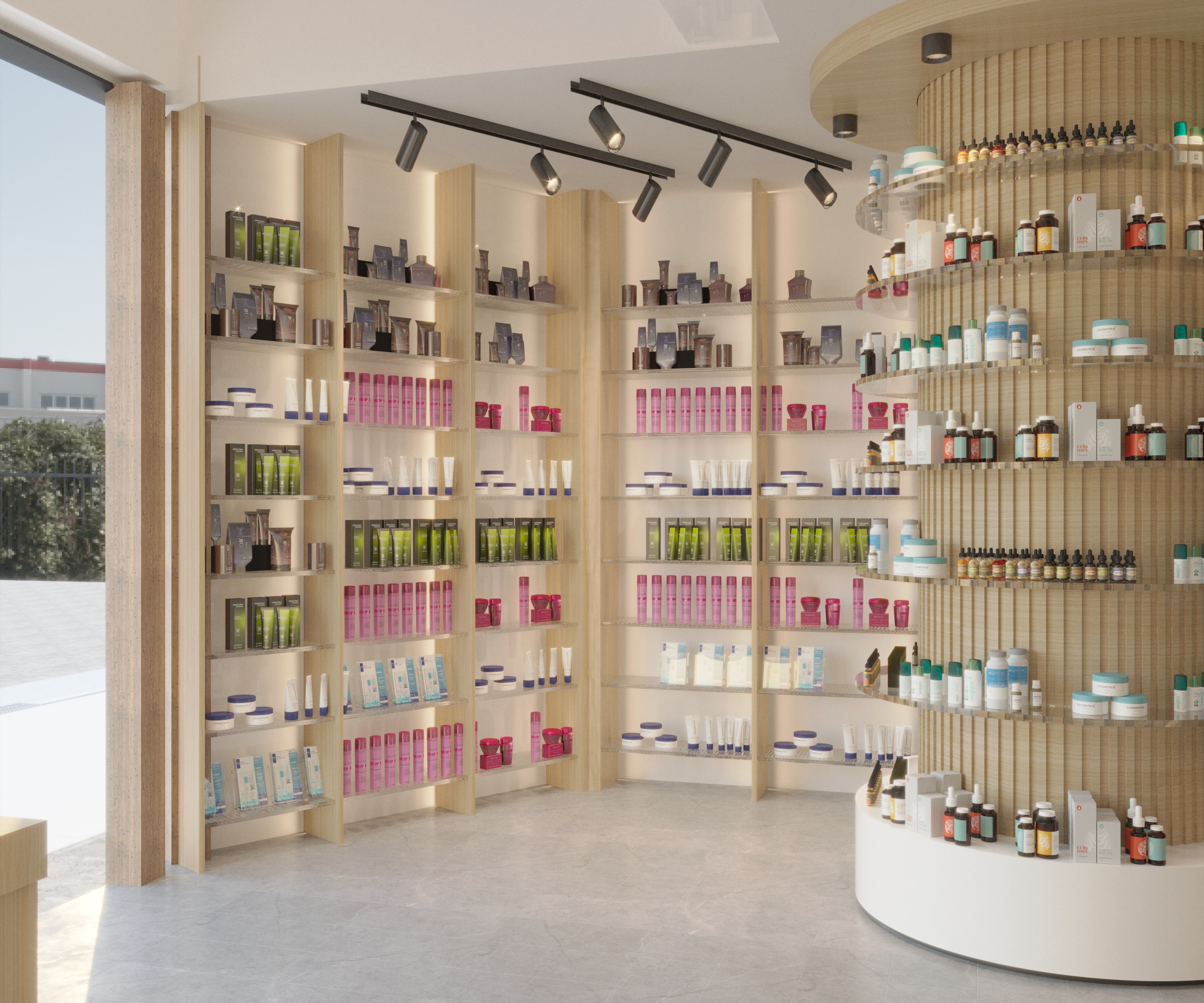 The design repositions a traditional pharmacy as a modern retail experience without compromising on functionality. The layout separates beauty retail from pharmaceutical services while maintaining a unified material palette across both zones. Warm timber finishes and black marble are used consistently to give the space a premium feel that sets it apart from a standard pharmacy interior. The exterior facade extends the same design language to the street, creating a coherent brand presence from the outside in.