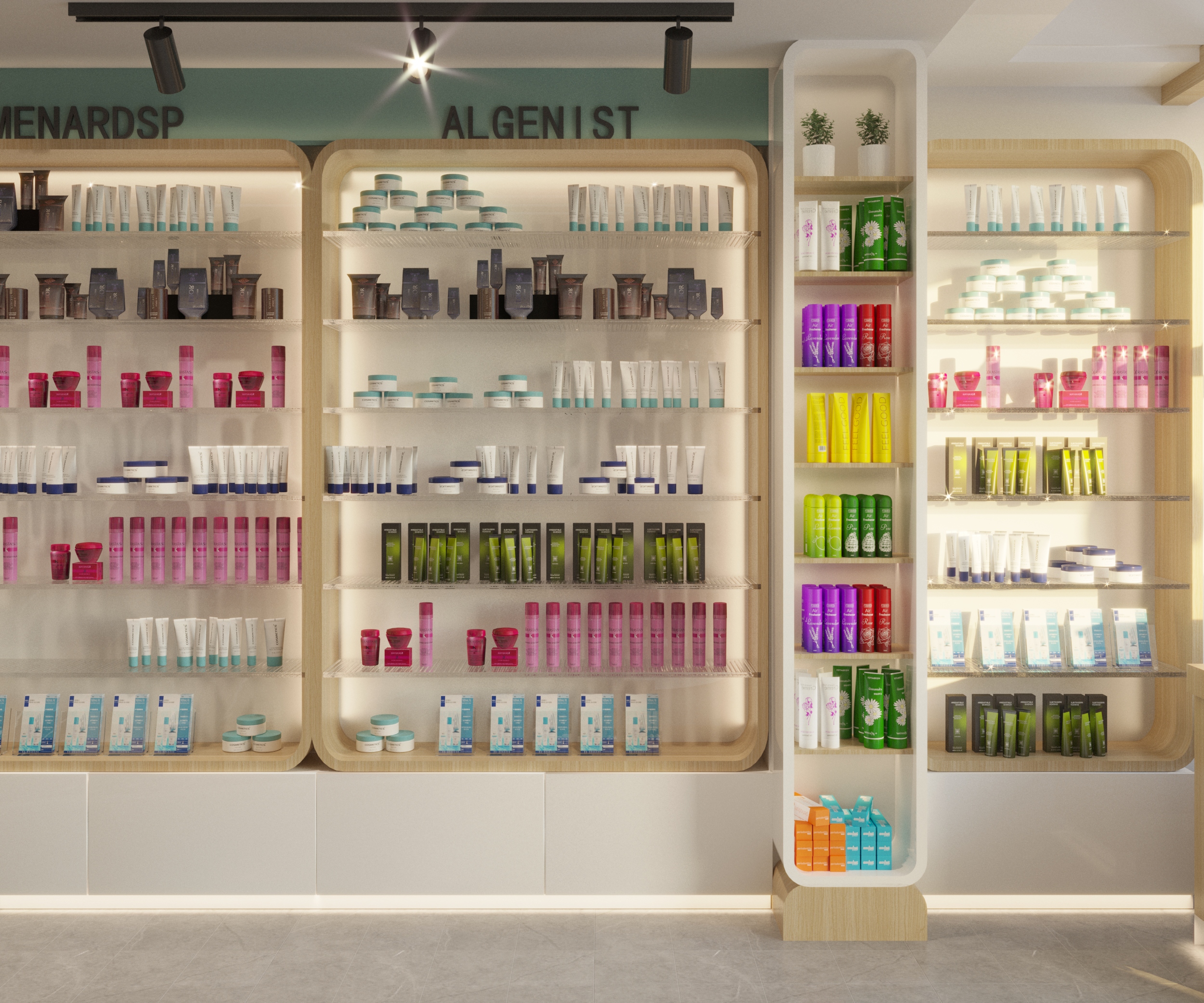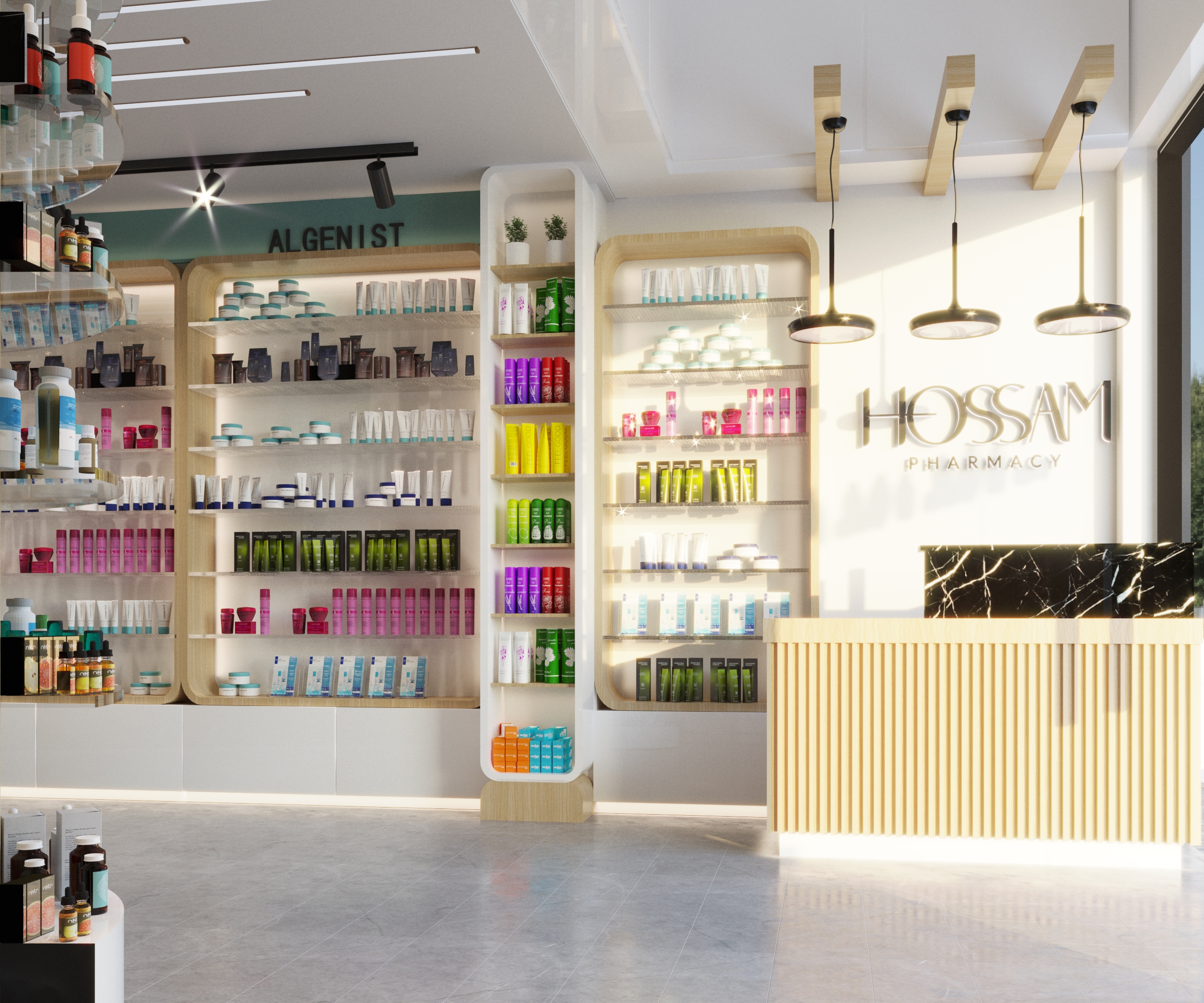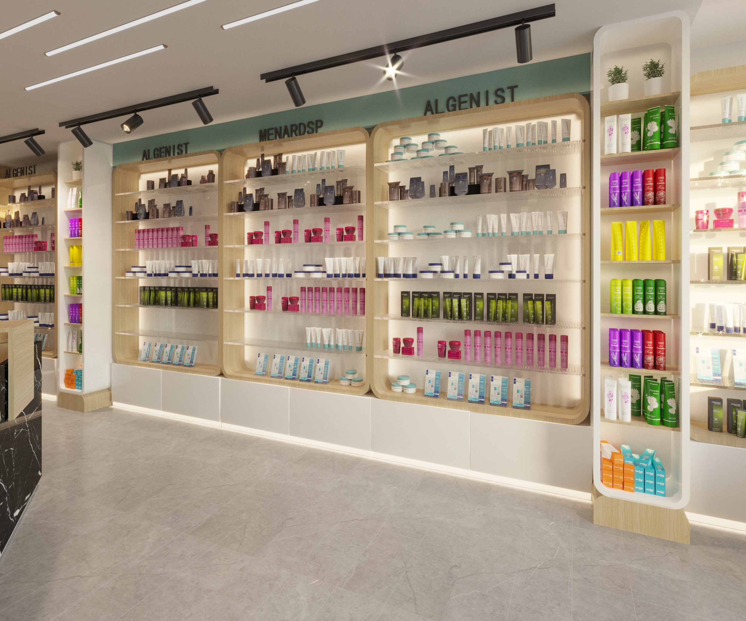 Lighting is a key element throughout, pendant lights over the reception, recessed linear ceiling strips in the pharmacy, and track spotlights used consistently across both spaces to highlight product displays.