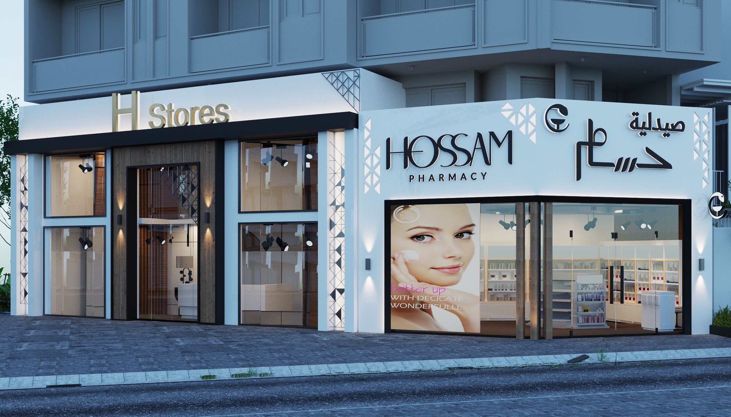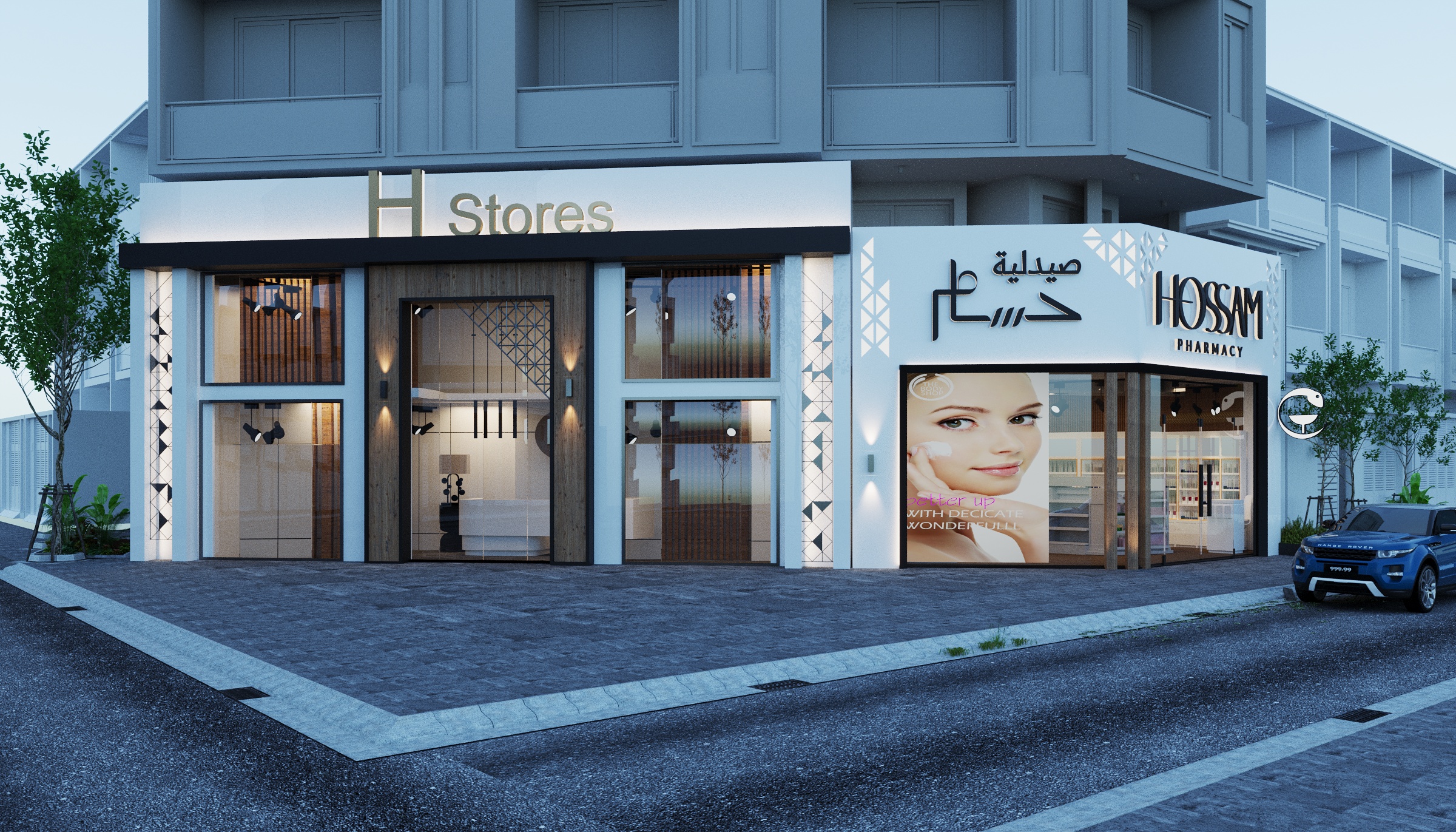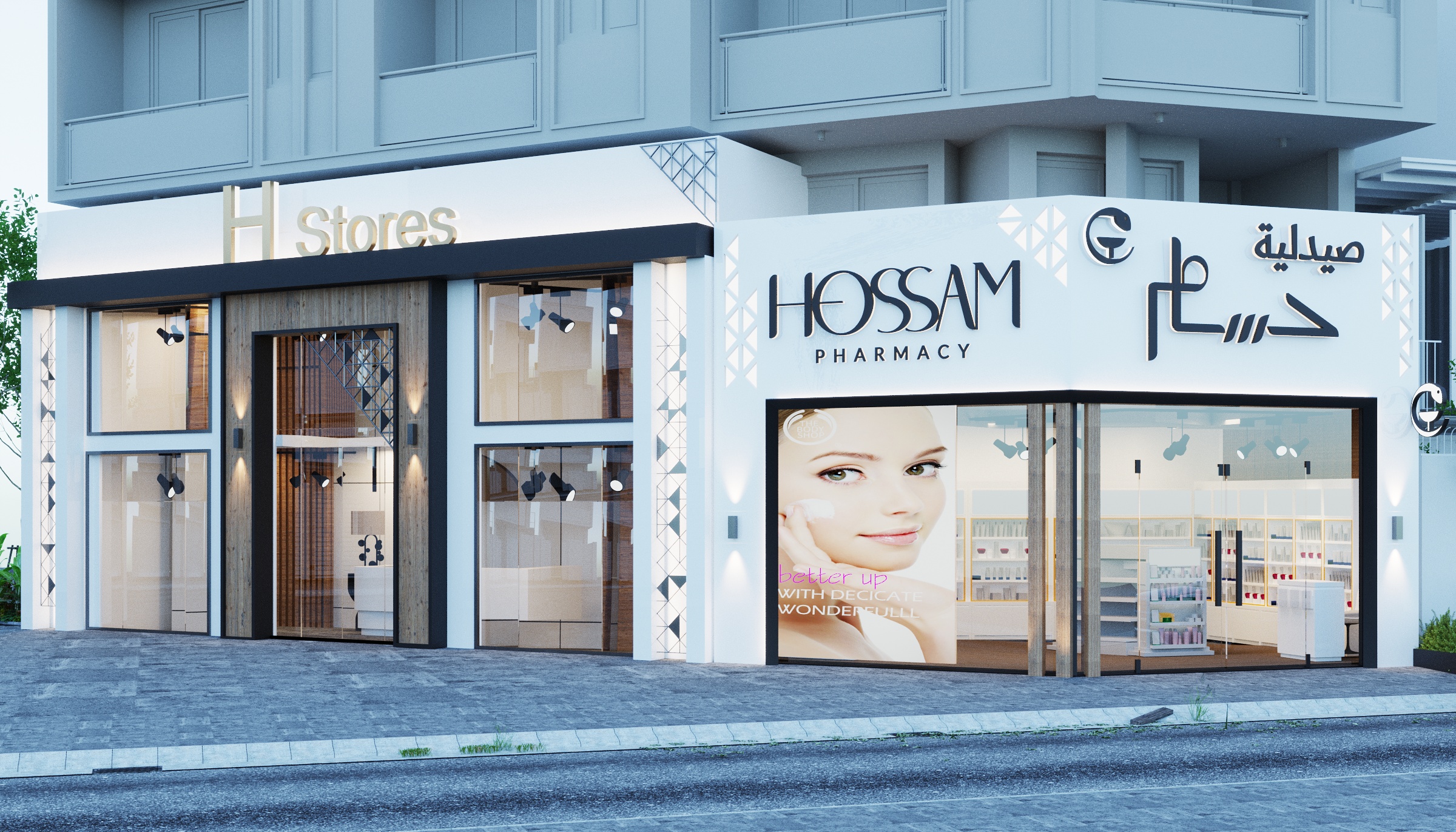 Hossam Pharmacy occupies a corner unit with a fully redesigned facade featuring white render, geometric tile detailing, floor-to-ceiling glazing, and bilingual signage in both Arabic and English. The H Stores retail unit sits adjacent, sharing the same facade language with the addition of timber slatted panels and track-lit display windows.