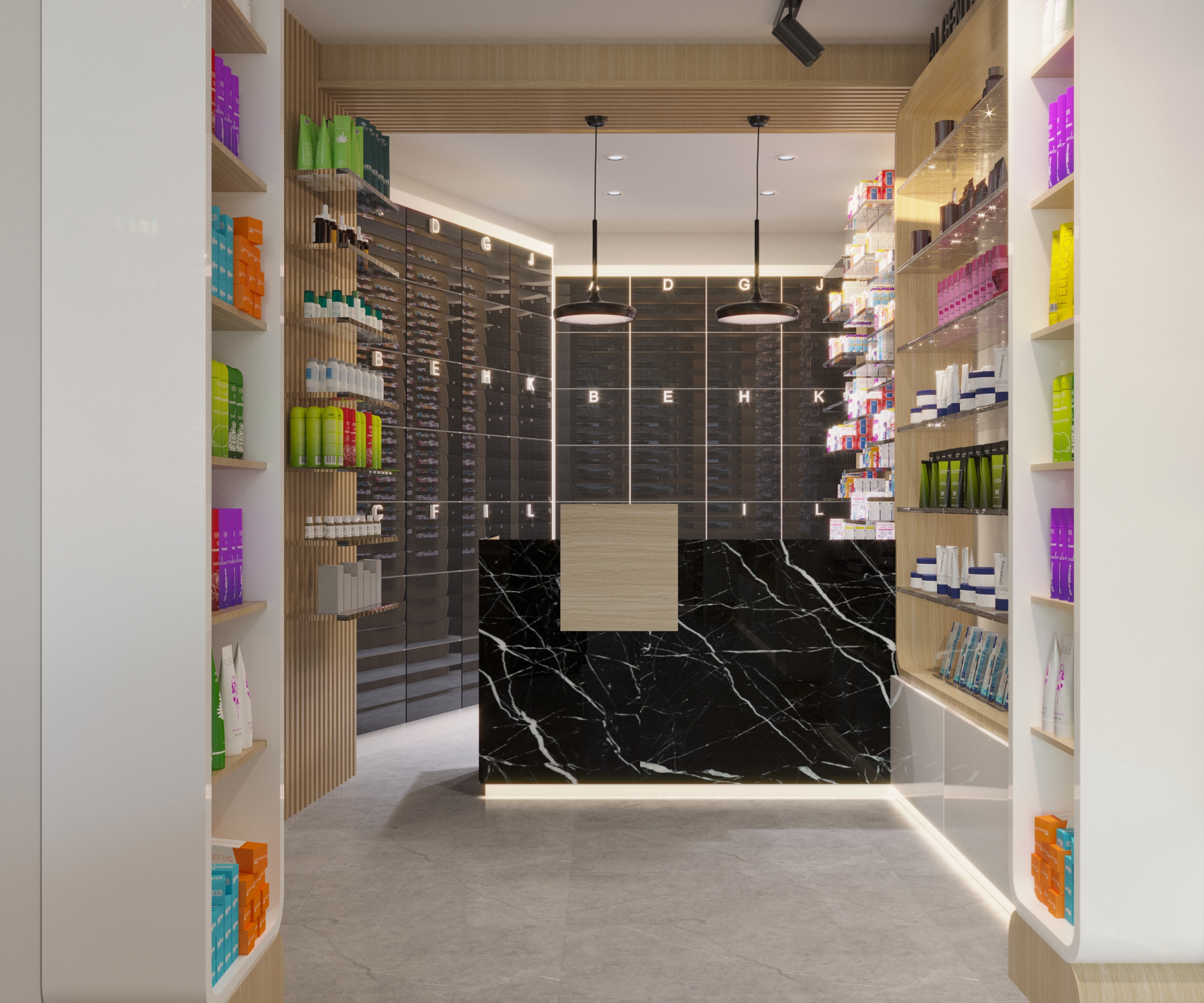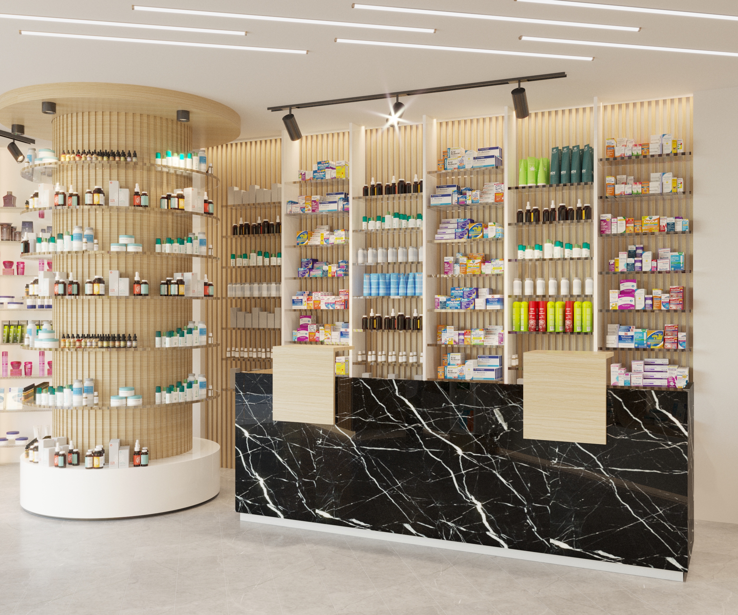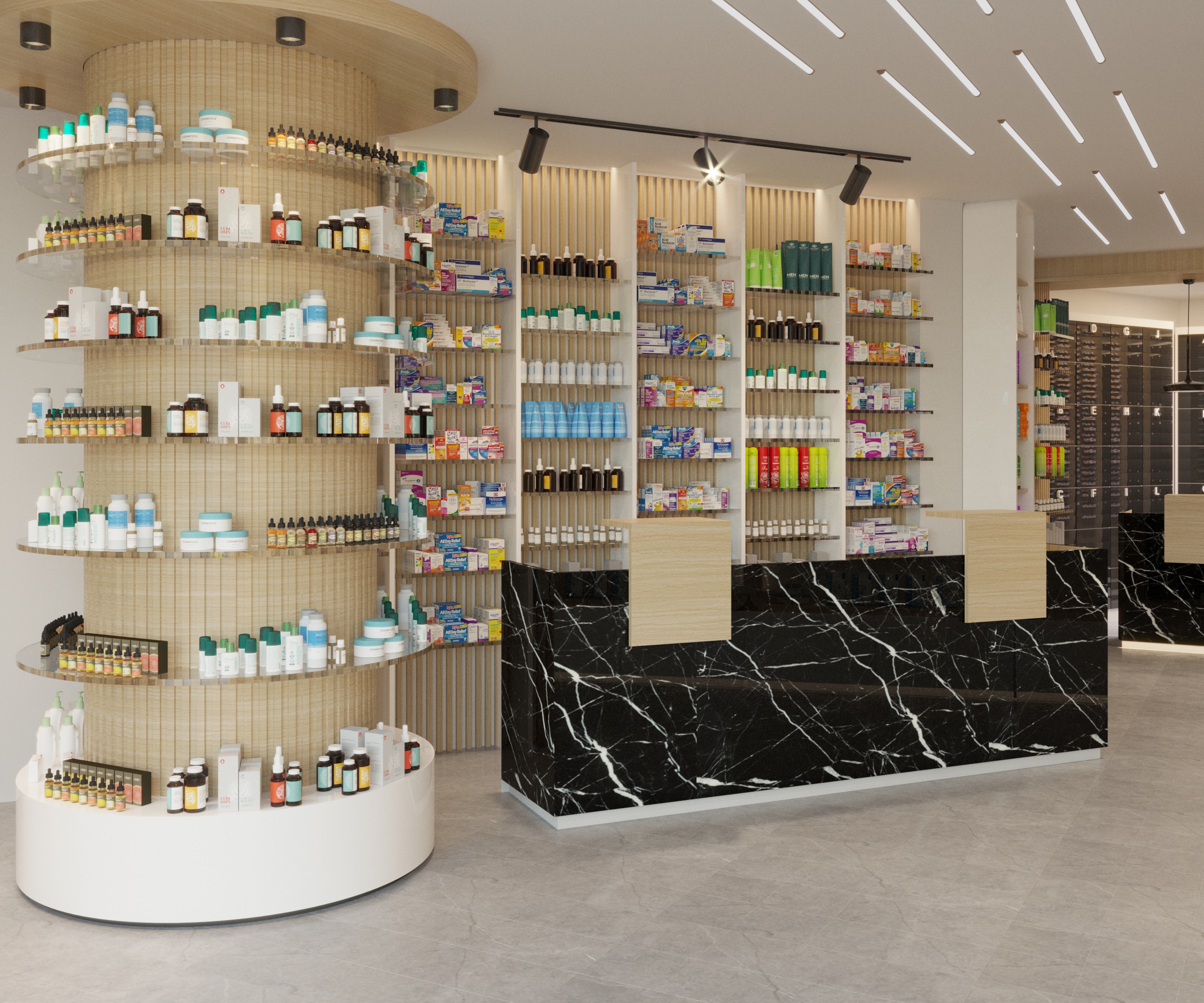 The interior is divided into two functional zones: a beauty and skincare section with backlit timber shelving, brand-dedicated display units, and a reception counter finished in black marble and timber slat cladding; and a pharmacy section with full-height wall shelving, a cylindrical freestanding display unit, and a long service counter in matching black marble.