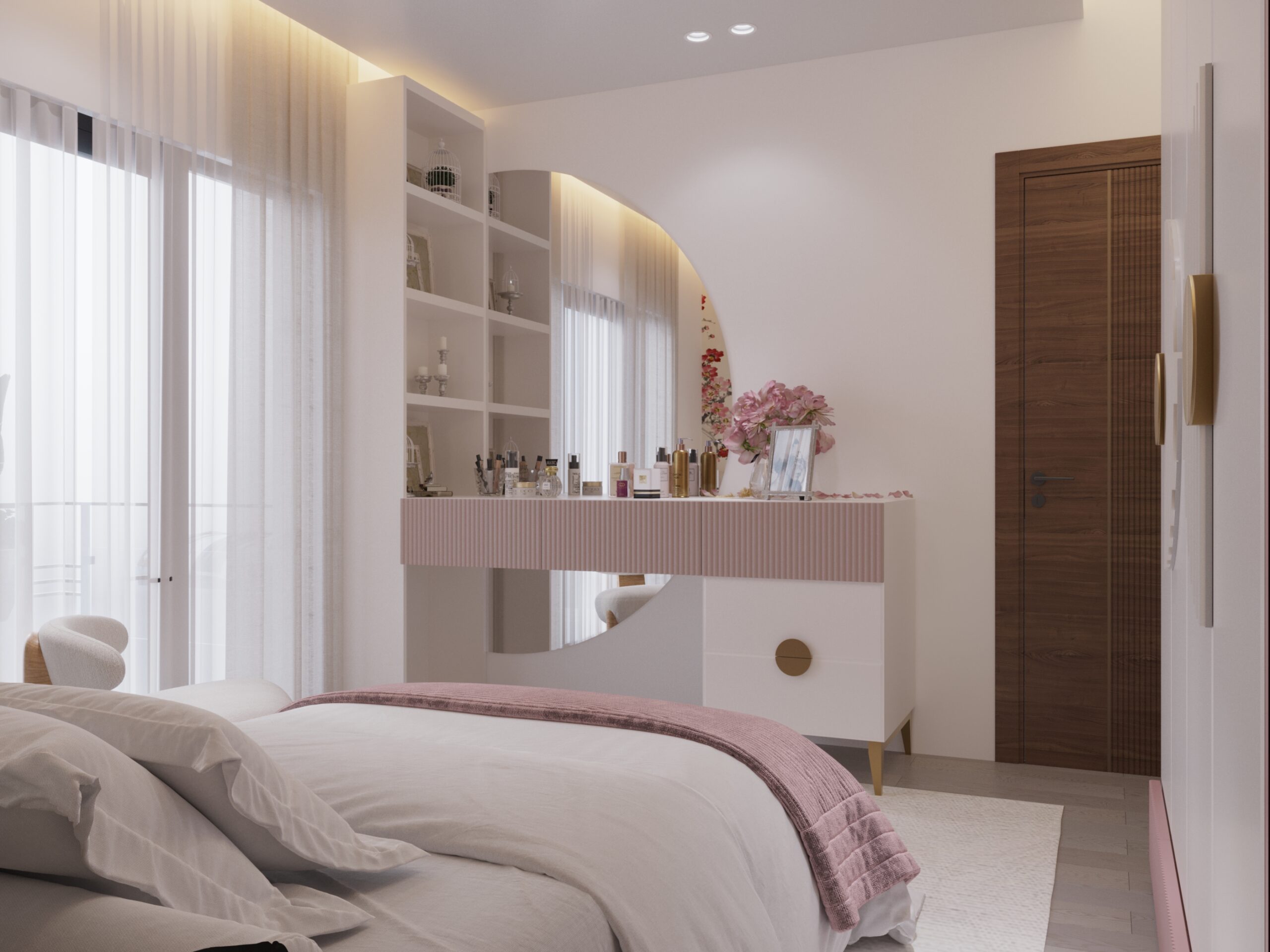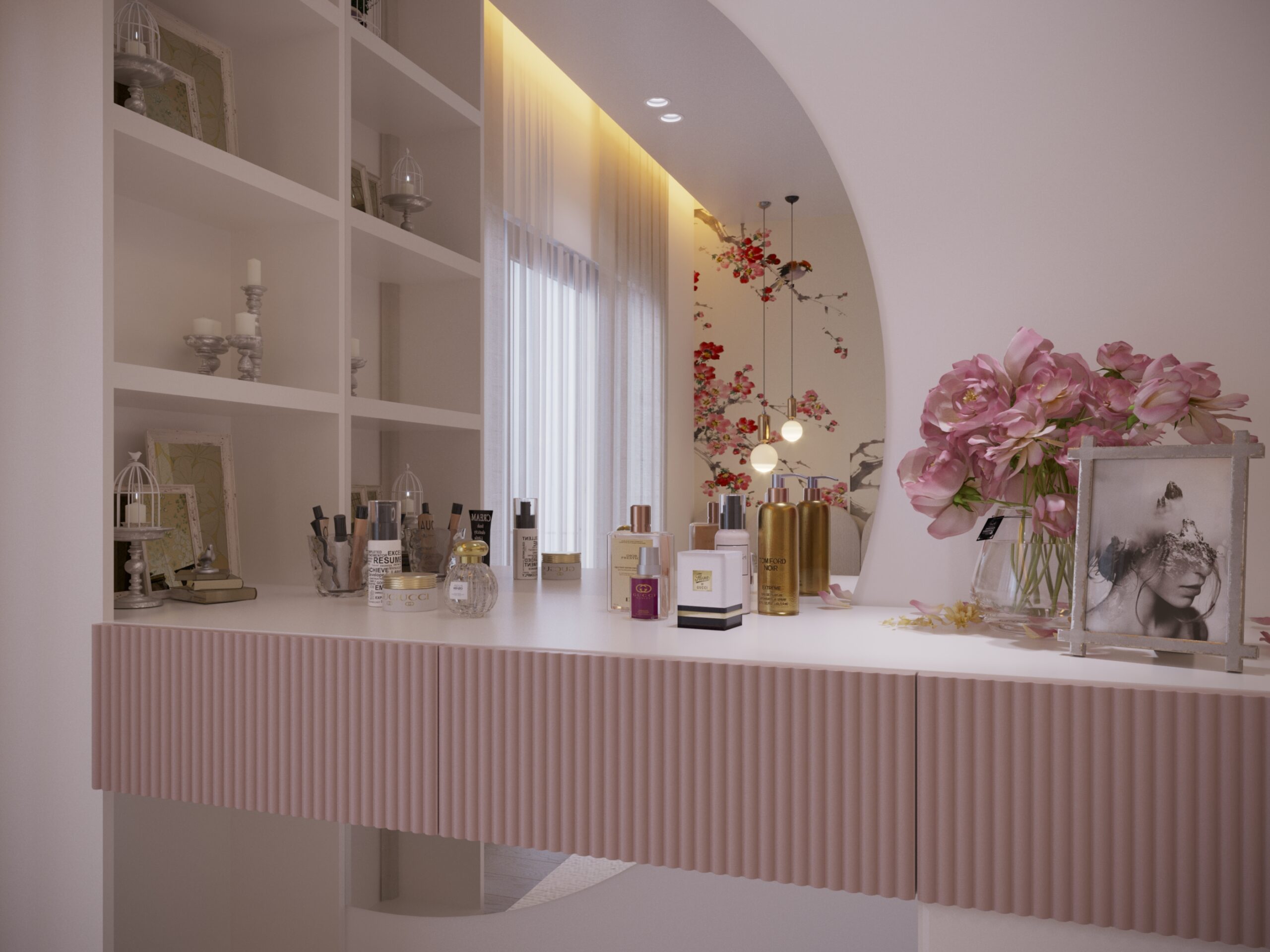 The room is designed as a personal retreat for a female homeowner with a strong emphasis on display and dressing as part of the spatial experience. The cherry blossom mural sets the decorative tone of the headboard wall, while the rest of the room stays white and pink to complement it without competing. Custom joinery gives equal attention to clothing and accessory storage, treating the handbag display as a designed feature rather than a functional afterthought. Brass hardware and gold lighting tie all elements together across the white and pink base.