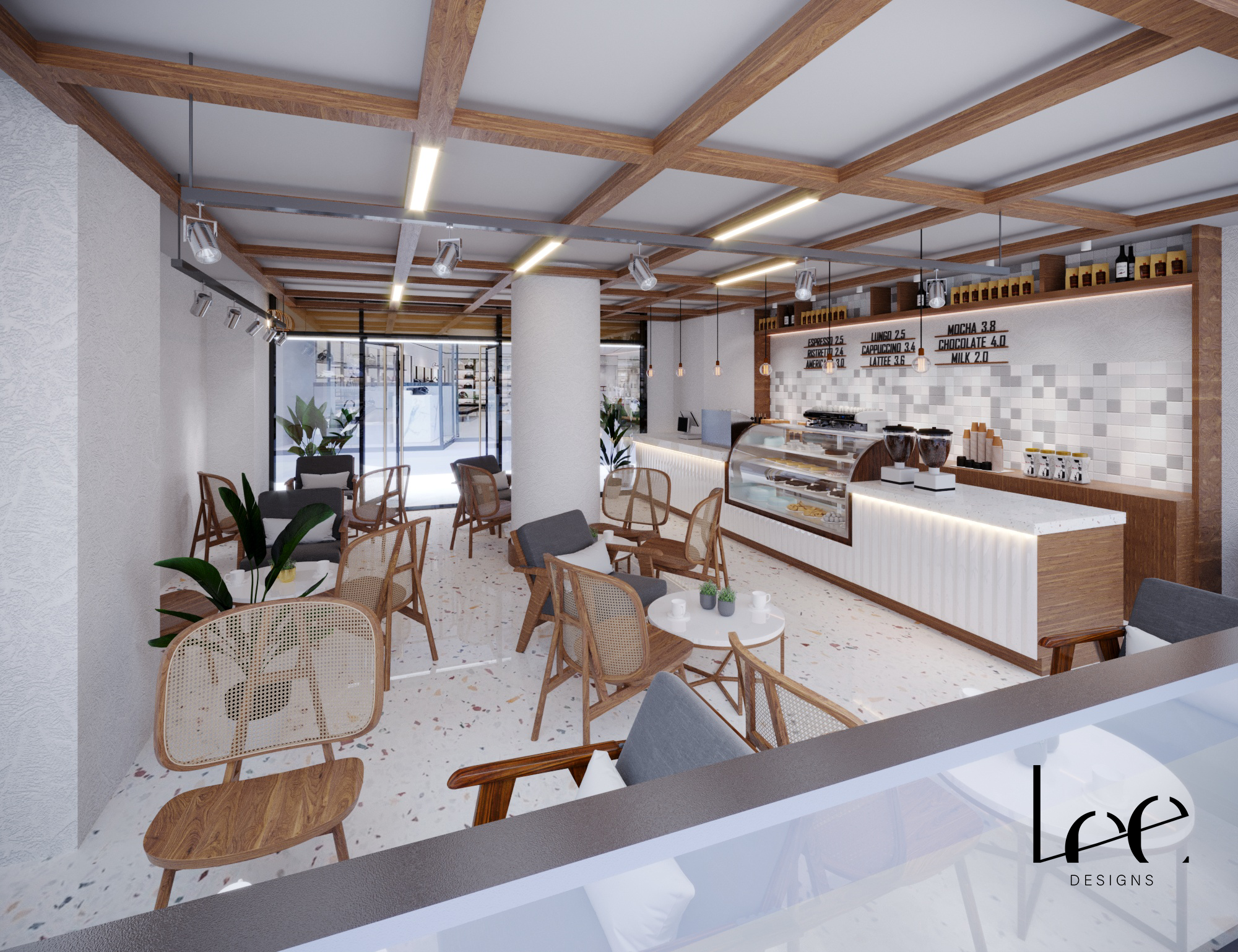 The design positions the café as a calm, tactile counterpoint to the surrounding retail environment. The all-white and natural timber palette keeps the space visually light and open while the terrazzo floor, coffered timber ceiling, and rattan furniture introduce material texture at every surface. The glazed shopfront makes the interior fully visible from the mall concourse, functioning as its own display. The integration with the adjacent fashion retail through the glass partition reinforces the café as part of a curated lifestyle retail experience rather than a standalone food and beverage unit.
