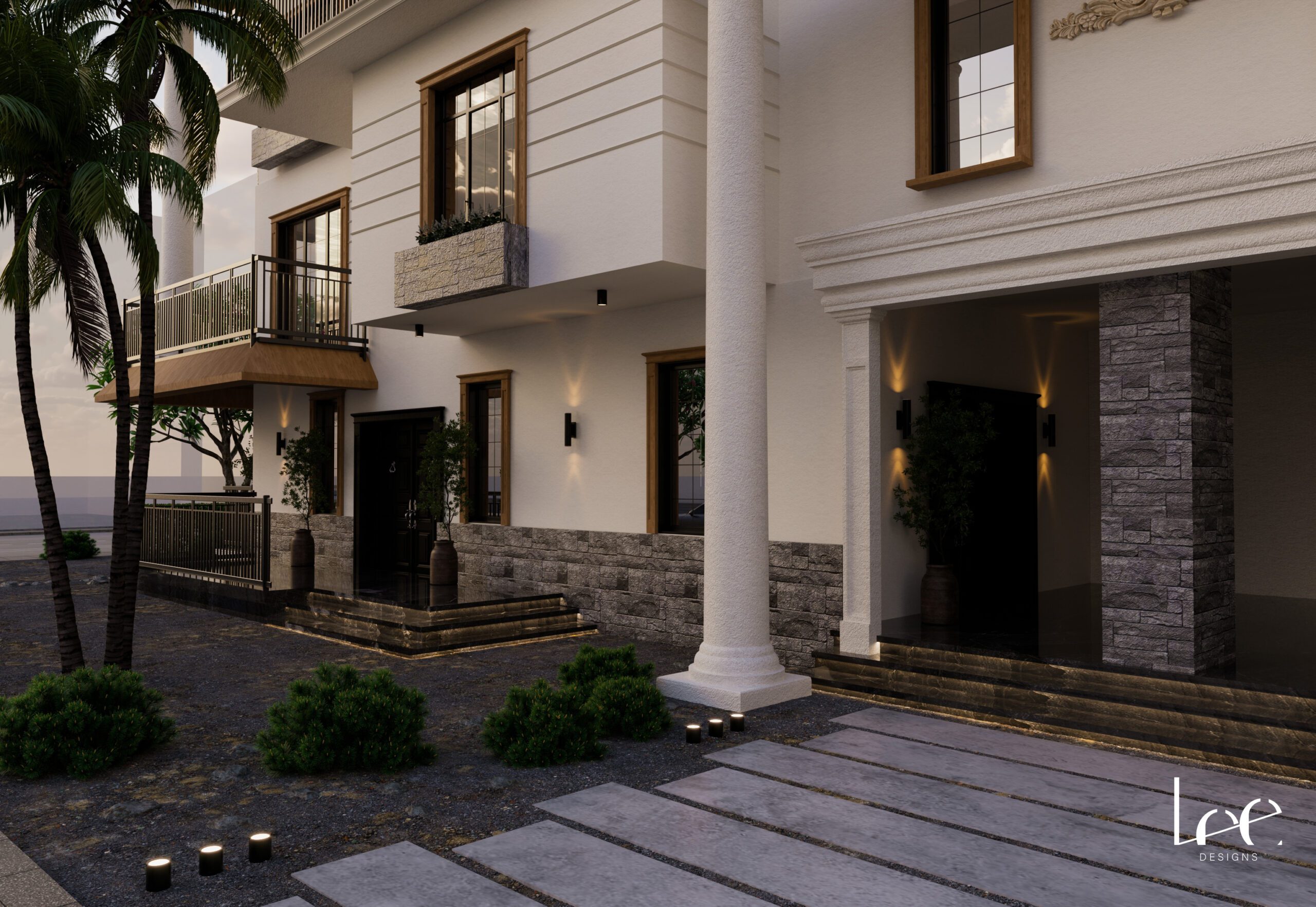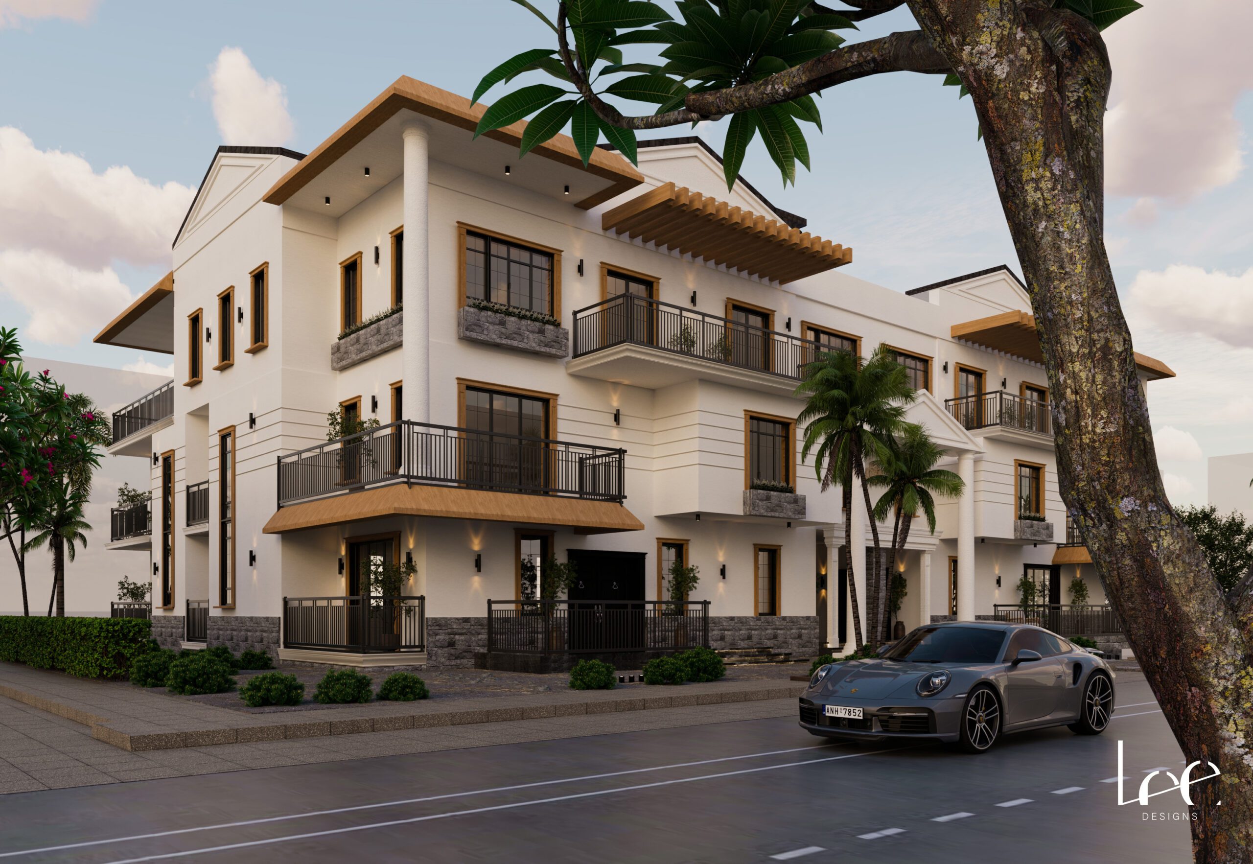 The design delivers a large multi-unit residential building that reads as a single unified villa from the street. The symmetrical facade with its classical entrance portico, repeating balconies, and consistent material palette gives the building a formal presence appropriate for a prominent street-facing plot. Warm timber detailing on window surrounds and pergola structures softens the classical composition and introduces a tropical residential character suited to the West African context. Each floor functions as an independent full-floor residence while sharing the same spatial organization and architectural language throughout.