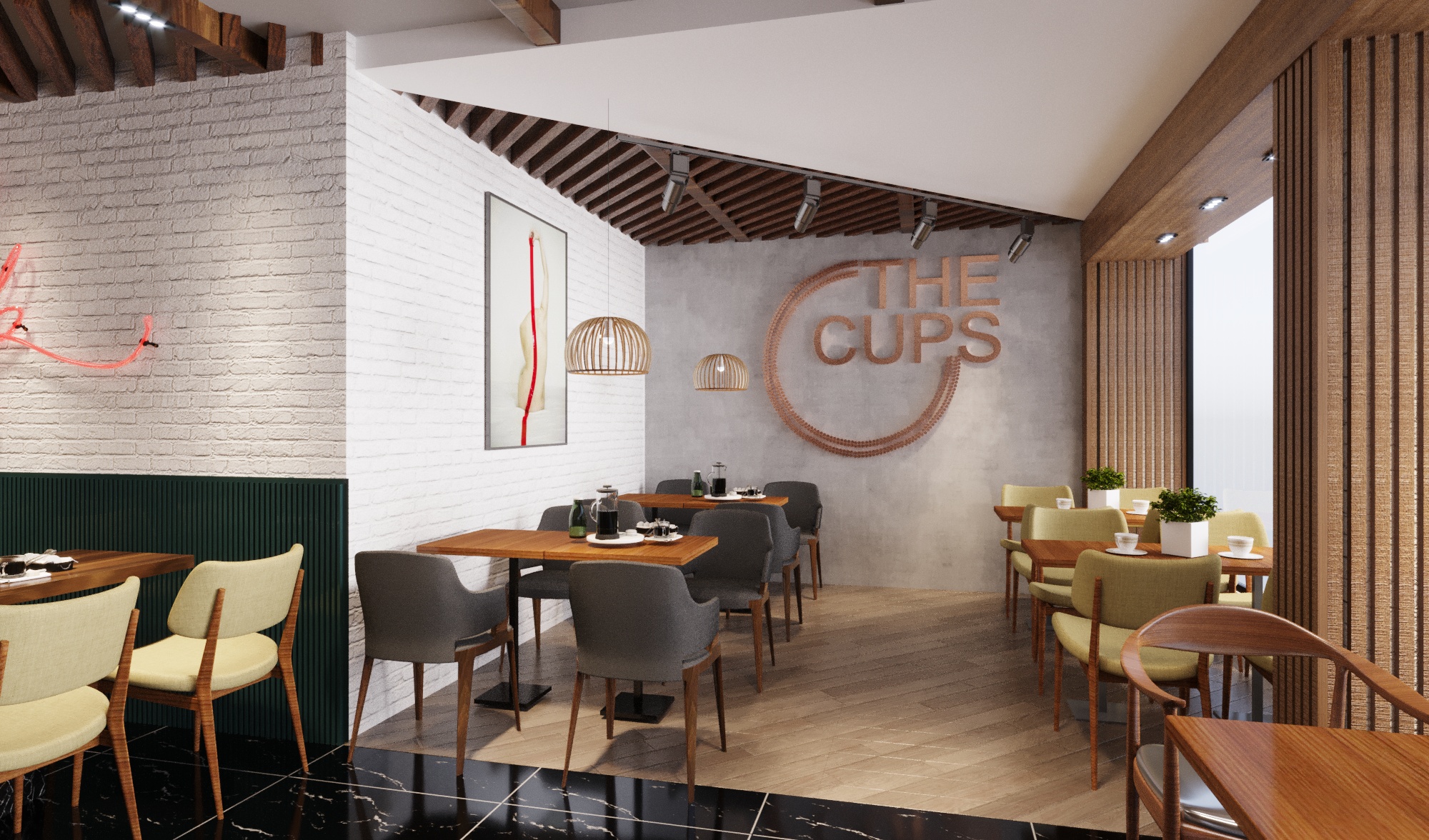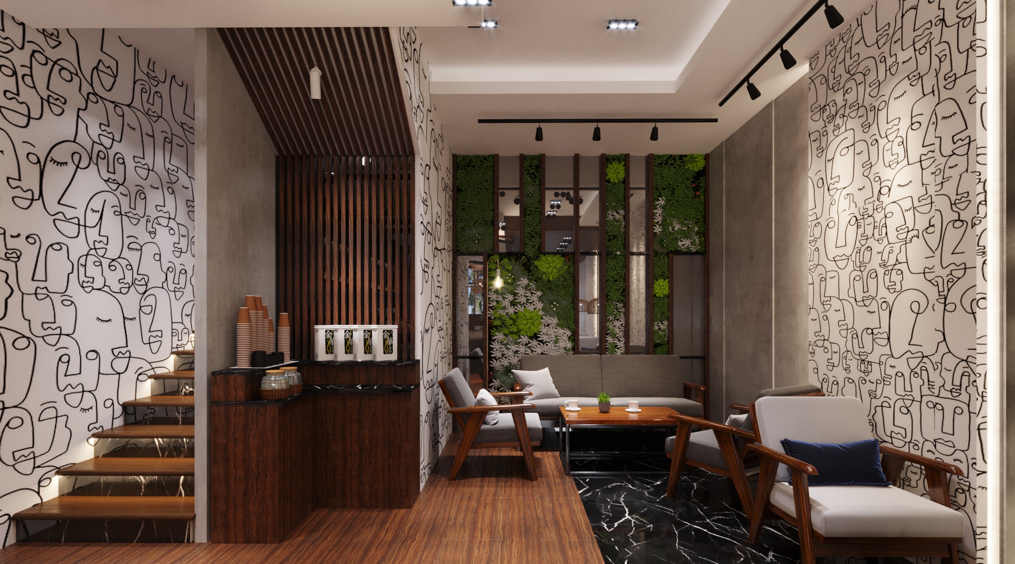 The design treats the café as a destination with multiple identities within a single space rather than a single-use F&B outlet. Each zone – dining, lounge, bar, and billiards – has its own material finish, lighting, and furniture character while the dark timber columns, beam ceiling, and black marble floor provide continuity across all areas. The illustrated line-art wallpaper, neon sign, and pop art paintings give the space a curated, gallery-like quality that sets it apart from a conventional café interior. The coffee bar is positioned as the visual anchor of the space, designed to be seen from every zone.