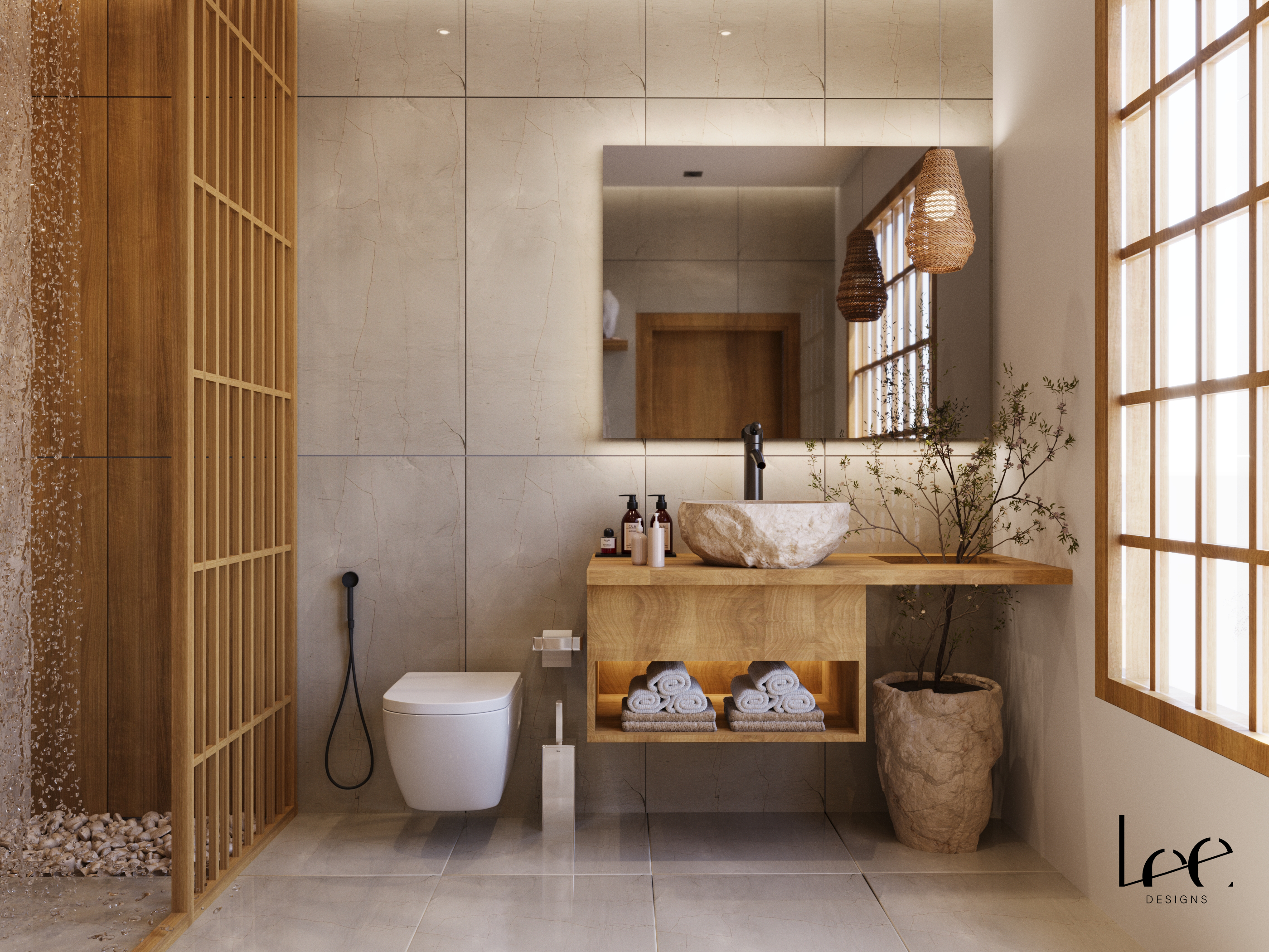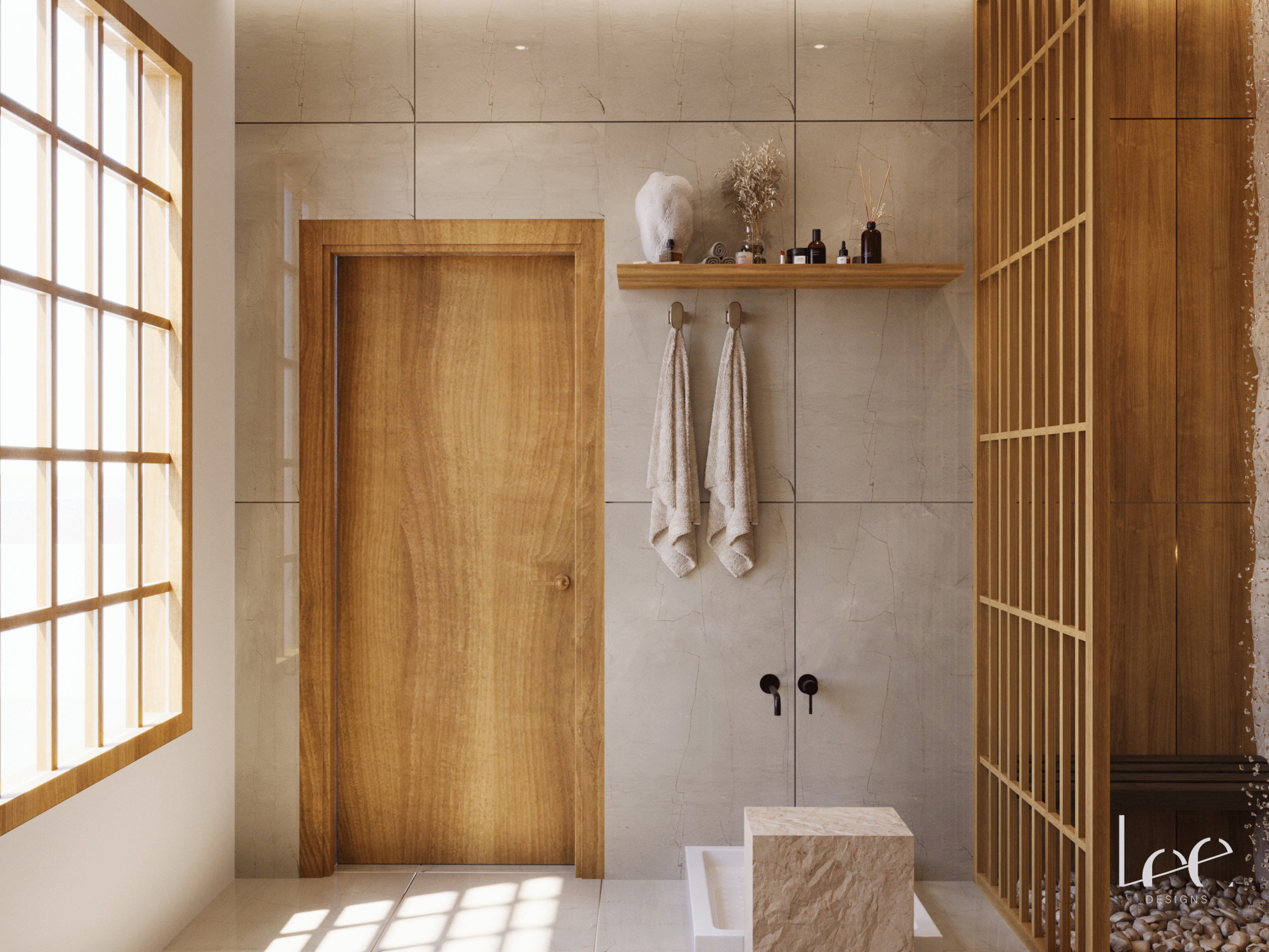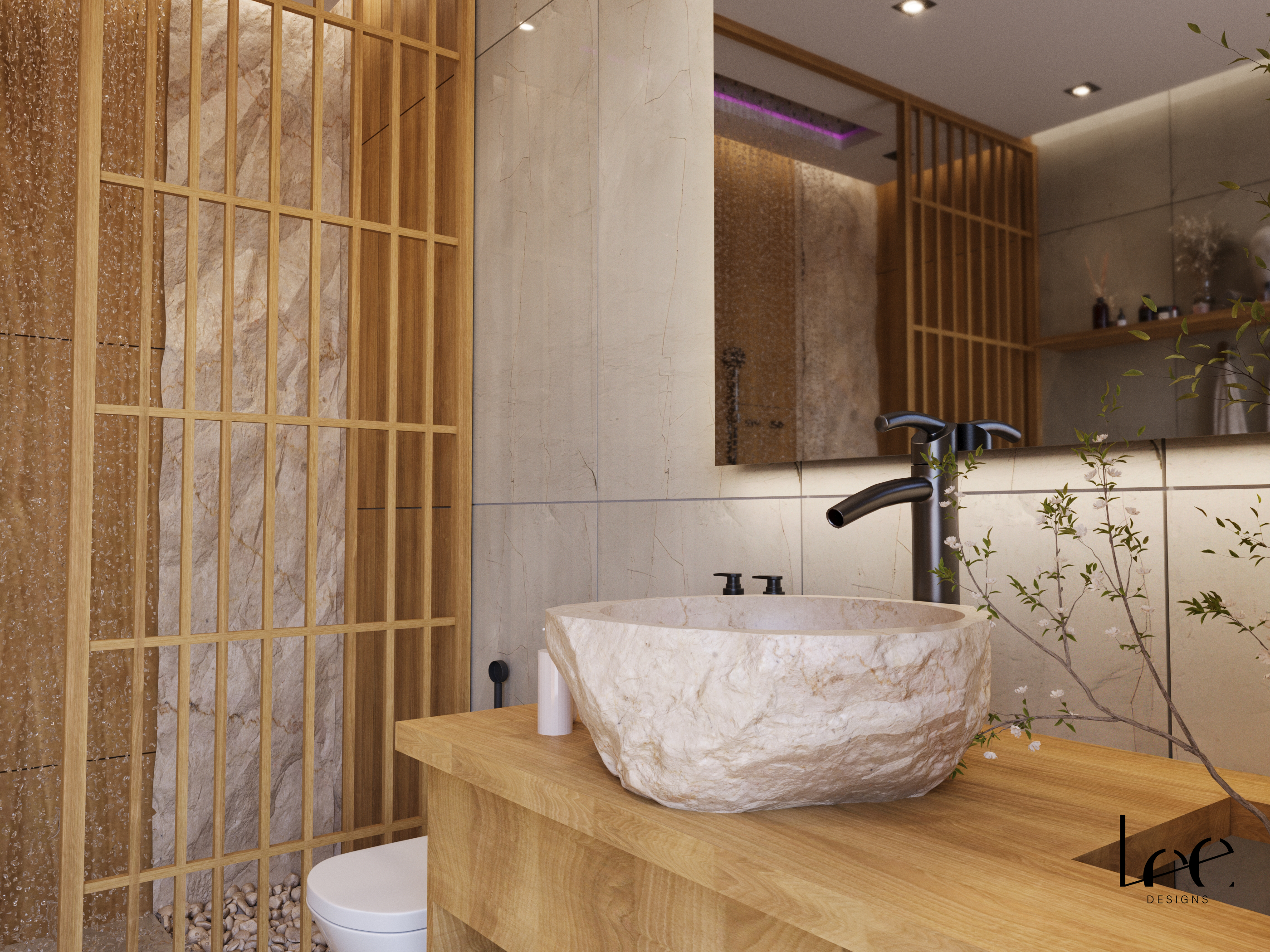 This bathroom embodies serene Japandi elegance, where natural textures and minimalist design create a tranquil retreat. A handcrafted stone basin serves as the focal point, complemented by warm wooden slats and a subtle shoji-inspired divider that softens the space. Neutral tones and soft lighting enhance the sense of calm, while clean lines and thoughtful detailing reflect both functionality and refined style. The result is a harmonious balance of Japanese-inspired simplicity and Scandinavian warmth, offering a space that feels both restorative and timeless.